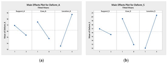 Main effect plot for tunnel deformation: (a) asymmetric widening of the tunnel; (b) symmetric widening of the tunnel.