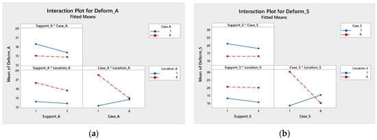 Interaction plot for tunnel deformation: (a) asymmetric widening of the tunnel; (b) symmetric widening of the tunnel.