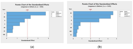 Pareto chart of the standardized effect: (a) asymmetric widening of the tunnel; (b) symmetric widening of the tunnel.