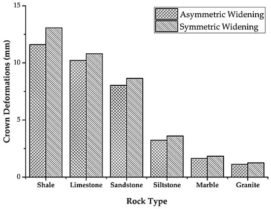 The tunnel deformation at the monitoring section of eight different tunnel shapes (Table 4) was observed during asymmetric and symmetric widening under three different support modes (Table 3). The deformation results are summarized in the bar chart presented in Figure 8.
