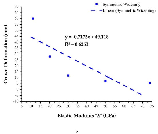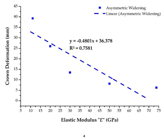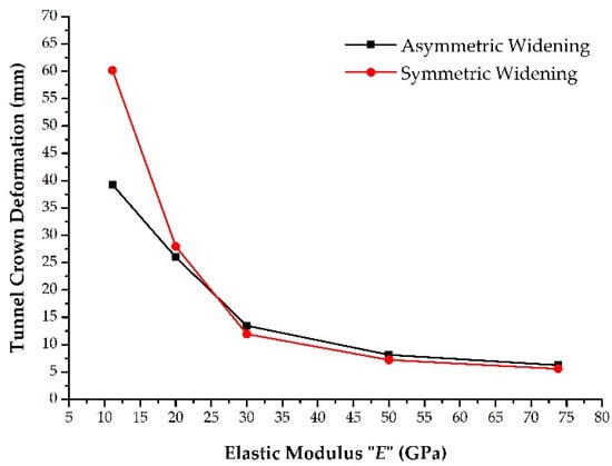 While evaluating the effect of the elastic modulus (E), it was found that the deformation of the tunnel is inversely proportional to the E, as with the increase of E, the deformation decreases. The difference in deformation in the tunnel increases as the rock gets softer. Therefore, for the soft rock mass, when the elastic modulus is smaller, the excavation of asymmetric widening can provide better results. Furthermore, the regression analysis revealed that the slope variation of symmetric widening is greater as compared to asymmetric widening with the variation of E.