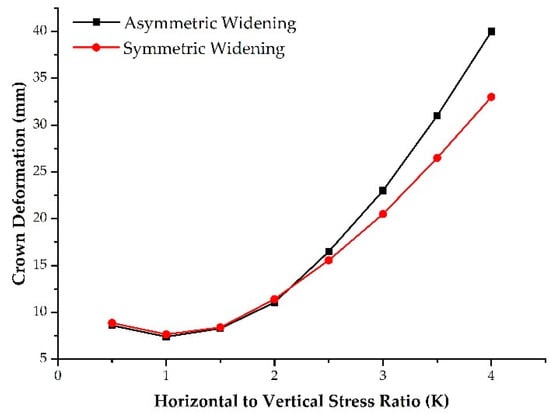 The value of the horizontal to vertical stress ratio (K) has a considerable effect on the tunnel deformation, in which the effect on the asymmetric widening is greater than that of its counterpart. Therefore, the slope is comparatively steep for asymmetric widening, hence revealing that the tunnel can widen symmetrically more comfortably with high K values.