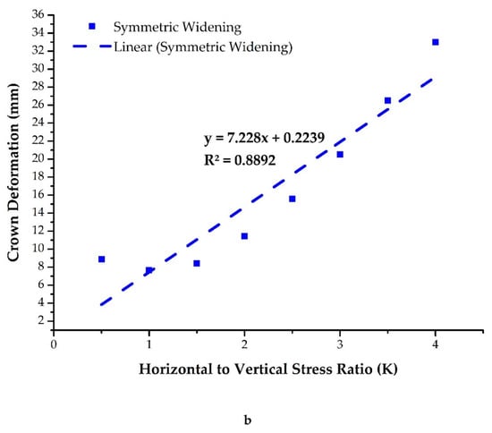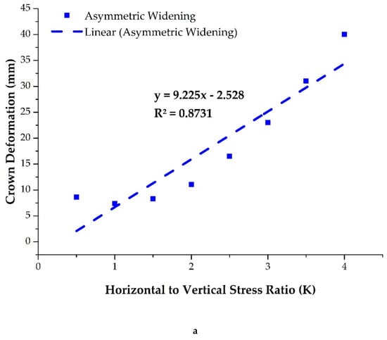 A different horizontal to vertical stress ratio (K) value was selected for parametric analysis while keeping the other parameters constant. In this respect, a different value of K, varying from 0.5 to 2.5, was selected. The correlation of different values of K and respective deformation at the crown for both asymmetric and symmetric widening is plotted in Figure 15. For the linear regression of the two separate graphs, as shown in Figure 16, two-separate equations are provided for both cases.