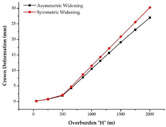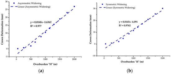 Mountainous tunnels are usually deep tunnels, and urban tunnels mostly have a shallow depth; therefore, it is also vital to get an understanding of the effect of overburden stresses on the tunnel widening for a variety of H values. For this purpose, the overburden of different ranges was considered for the study between a shallow depth of 50 m to the deep tunnel depth of 2000 m for a horseshoe tunnel while keeping all other parameters constant. The differences in the behavior of rock mass deformation in asymmetric and symmetric widening are shown in Figure 17. The linear regression analysis of the two separate widening modes is shown in Figure 18, which provides the two separate equations.