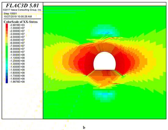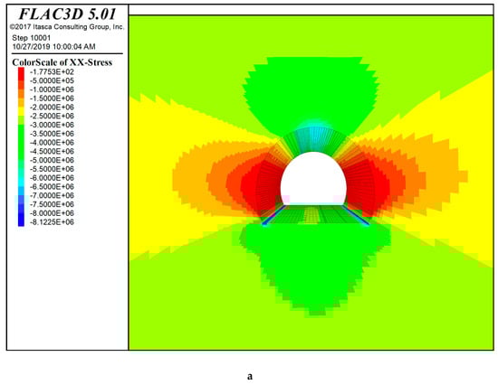 The stresses on the tunnel are directly linked with H under the prevailing conditions of the tunnel model in the study. A stress comparison is shown in Figure 19, wherein the horizontal stresses are critical because K = 2, compared to at depths of 50 and 2000 m, where the ground stress becomes 2.7 and 108 MPa, respectively. The side walls show that the stress accumulation in the wall at a depth of 50 m is less than 1 MPa; however, the stress accumulation in the wall at a depth of 2000 m is around 12 MPa. Thus, the stresses have a great influence on the deformation of the tunnel owing to the considerable difference in the stress at the widening zone of the tunnel. The variation in deformation in both asymmetric and symmetric widening can be examined in Figure 17.