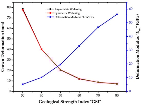 The Hoek–Brown criterion [] was used for this study. This includes the GSI as one of the main parameters, and the value was picked from the chart defined by Hoek et al. []. The value of GSI was taken as 60 for the main study. The value of the parameter was varied to determine the effect of rock mass behavior and effect of the difference of the two modes of excavation—asymmetric and symmetric widening of the tunnel. For this purpose, the GSI of different ranges was considered for the study between very poor to excellent rock conditions by varying the value of the GSI between 30 and 80 for the horseshoe tunnel while keeping the other parameters the same. As the tunnel was excavated with controlled blasting of excellent quality, the value of the Disturbance Factor (D) was taken as D = 0. The correlation between GSI and tunnel crown deformation is shown in Figure 20. This plot shows the effect of GSI on the Deformation Modulus “Erm” deduced from the equation proposed by Hoek and Diederichs []. The plot shows that for the considered set of values used for the estimation of Erm, for GSI values between 50 and 70, Erm is approximately directly proportional to the GSI. Furthermore, with D = 0, the plot also shows a resemblance to the plot of the simplified Hoek and Diederichs equation (as mentioned at Equation (4)) for Chinese and Taiwanese data, which is based on the sigmoid function []. The linear regression analysis between GSI and crown deformation is shown separately for asymmetric and symmetrical tunnel widening in Figure 21, which provides the two separate equations for both the cases.