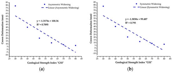 Deformation trend for tunnel widening with respect to different ranges of GSI for (a) the asymmetric widened tunnel, (b) the symmetric widened tunnel.