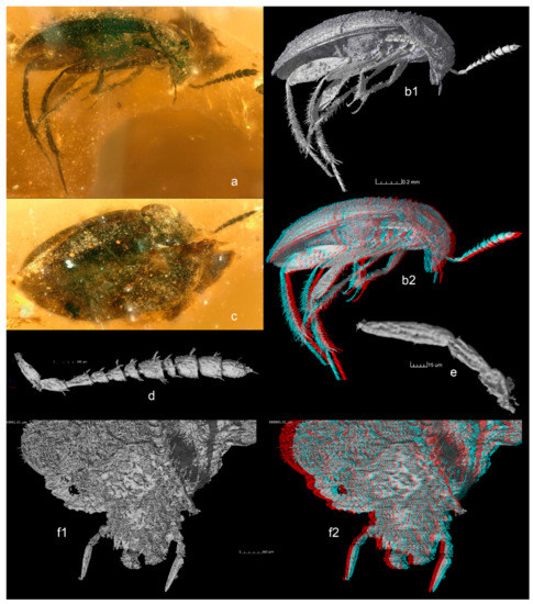 Cretaciella sorianoae gen. et sp. nov. (a) Habitus, lateral view (usual optics). (b1,b2) Same, lateral view (tomographic reconstruction). (c) Same, dorsal view (usual optics). (d) Left antenna. (e) Maxillary palpus. (f1,f2) Head and pronotum, frontal view.