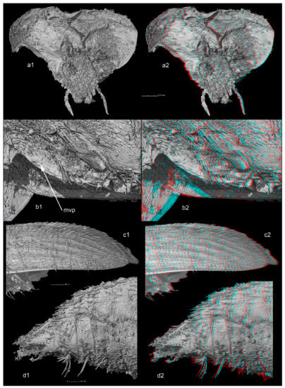 Some structural details, which are not appropriately illustrated even by tomographic pictures, due to the bad preservation conditions of the specimen or the weak contrast generally observed with Cretaceous samples, are also illustrated in three dimensional anaglyphs. They can be visualized with red/cyan glasses. The corresponding standard and anaglyph pictures have the same letter with an additional number “1” (standard) or “2” (anaglyph). When only the standard picture is given, no number is added.