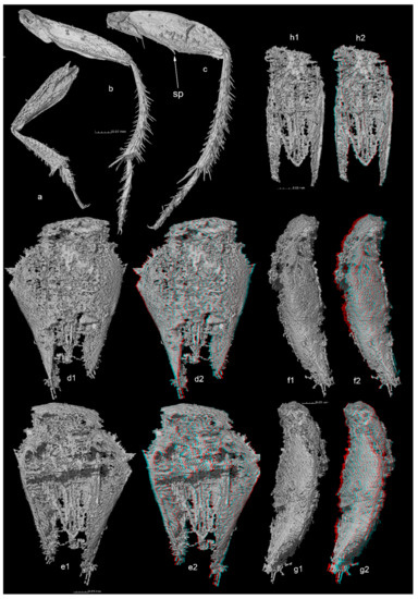 Cretaciella sorianoae gen. et sp. nov. (a) Right fore leg, dorsal view. (b) Right middle leg, dorsal view. (c) Right hind leg, dorsal view (sp—femoral spine). (d1,d2) Genital segment, ventral view. (e1,e2) Same, dorsal view. (f1,f2) Same, right lateral view. (g1,g2) Same, left lateral view. (h1,h2) Aedeagus, dorsal view.