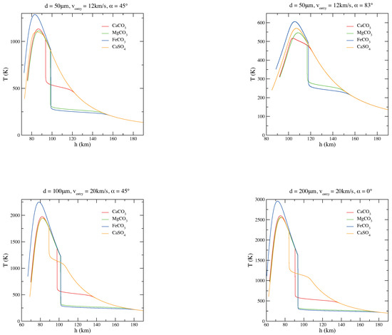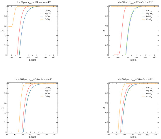To get a better understanding of the grain behavior depending on its chemical composition, comparisons of the thermal histories of magnesite, siderite, calcite, and anhydrite micrograins are plotted as a function of the quota h (Figure 2). Figure 3, instead, shows the carbonate/sulphate fractions of the corresponding entry scenarios of Figure 2. As it is clear from Figure 2 and Figure 3, the composition of the original carbonate micrograin changes very fast while entering the atmosphere: during the descent, it releases CO and becomes a solid mixture of carbonate and oxide. When CO is completely evaporated and the grain becomes pure oxide, the grain mass does not change anymore and the temperature increases dramatically, only mitigated by blackbody radiation [34,35]. On the other hand, a sulphate micrograin can survive the atmospheric entry with a partial decomposition [36].