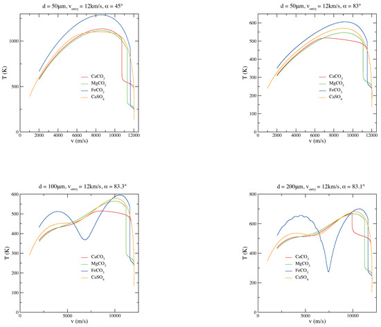 Comparisons among MgCO, CaCO, FeCO, and CaSO micrograin thermal histories for various diameters (d), velocities (v), and entry angles () of the particle.