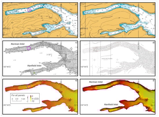 The implications of the new data are considerable detail for Norman, Hanfield, and McLennan Inlets and Fly Habour (Figure 2). Sills are major geomorphic features in the fjords and while an older version of the chart shows sills in Norman and Hanfield inlets, Fly and McLennan were not surveyed at that time. Text on both epochs of the chart report a local magnetic anomaly at Shoe Island in Port Ross and point users to the Notes. The 2005 version states “Shoe Island is reported to be highly magnetic”, while 2017 comments “A local magnetic anomaly is reported to exist in the area indicated on this chart”. This is likely related to the volcanic origins of the island group [39] (Figure 2). Interestingly, the post-2015 chart (Figure 2 and Figure 3b) includes far less detail than its predecessor.