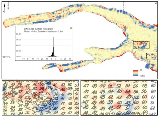 All the concerns discussed above are apparent in the difference map created by subtracting the surface created by digitized pre-2015 fairsheet from the post-2015 surface (Figure 4). A grid-like pattern of alternating positive and negative differences in flat areas is due to different grid spacings of two datasets. Echo sounding records the shoalest point within the beam footprint. Multibeam sounding footprints are smaller than singlebeam, thus they more precisely represent the seabed within each footprint along the swath. With the use of GNSS positioning, the horizontal location of this shoalest point is similarly more precise [13]. This effect is evident in the negative differences along the fiord walls (Figure 4a). The post-2015 multibeam survey better represents their steep slopes than does the pre-2015 survey. The positive differences along the coastline are due to the wider multibeam swath, which measures much further beyond the nadir region of the vessel.