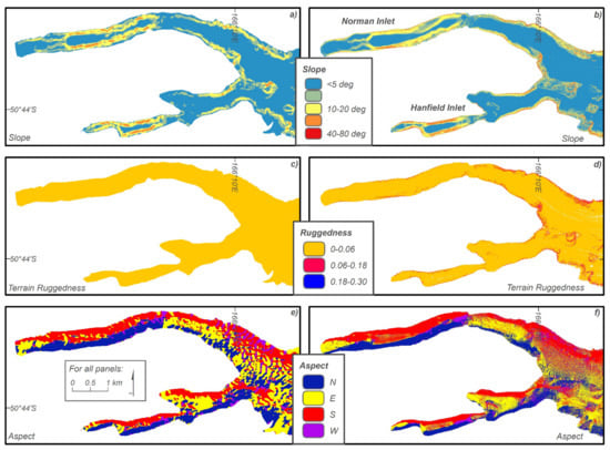 Bathymetric surface outputs for the Norman and Hanfield Inlet study area created using Benthic Terrain Modeler (BTM) v.3.0 in ArcMap 10.3.1 [37]: (a) Pre-2015 slope; (b) post-2015 slope; (c) pre-2015 terrain ruggedness; (d) post-2015 terrain ruggedness; (e) pre-2015 aspect; (f) post-2015 aspect.
