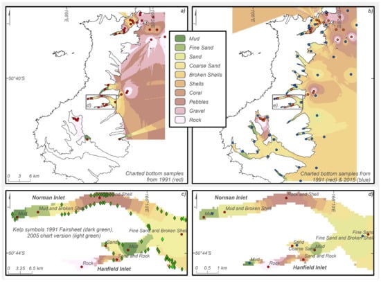 Bottom samples and chart symbols translated into sediment-type maps: (a) Surface from bottom samples from pre-2015 chart NZ2862 (2005); (b) surface from bottom samples from post-2015 chart NZ2862 (2017); (c) Norman and Hanfield Inlet surface from bottom samples from chart NZ2862 2005 edition, with location of plotted kelp symbols (green diamonds); (d) Norman and Hanfield Inlet surface from bottom samples from chart NZ2862 2017 edition.
