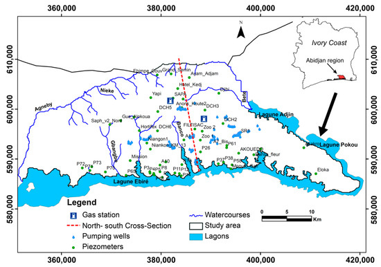 The geographic coordinates of the modeled area are given in the WGS 1984 UTM Zone 30 North reference frame between 350,000–421,000 m on the x-axis, and 581,000 and 609,000 m on the y-axis. This area covers a domain of 986.8 km2 with a perimeter of 266.68 km. The modeling zone is limited to the north by contact with the crystalline basement and the Bété and Nieké Rivers, to the south by the northern edge of the Ebrié Lagoon, to the east by the Adjin and Potou Lagoons, and to the Bété River and the West by the Agnéby and Niéké rivers (Figure 1).