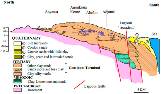 The coastal sedimentary basin in Abidjan is composed of three aquifers: the Quaternary aquifer, the Continental Terminal aquifer, and the Maastrichtian aquifer. The Continental Terminal aquifer covers the entire surface of the coastal sedimentary basin in the form of high plateaus, with the exception of the Quaternary littoral area [40]. This aquifer is unconfined, and includes four levels from top to bottom. The formations encountered are discontinuous lateritic cuirass and locally sandy clays or clayey sands, coarse fluvial sands, mixed clayey sand and black clay, and gravelly sands; however, most formations are clayey sands interspersed with variegated clay [36,37,40]. Figure 3 and Figure 4 show that the different layers of the sedimentary basin at the study scale are not homogeneous over their extent. The Continental Terminal aquifer, which is also known as the Abidjan aquifer, is the main source of drinking water for the district of Abidjan. The water supply system is operated by the Water Distribution Company of the Ivory Coast (SODECI). The waters of the Continental Terminal are drained by the Ebrié Lagoon [37] and feed the Maastrichtian aquifer when there are no ferruginous sandstone clays separating the two aquifers [40]. The reserves in the Continental Terminal aquifer are renewed by direct infiltration or percolation through Quaternary formations [31]. According to Kouame [28], the Abidjan aquifer recharges from one to four months after the long rainy season.