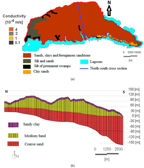 Model characteristics: (a) map of the superficial geological formations of the model and the corresponding hydraulic conductivities, and (b) north–south profile of the model layers.