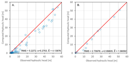 Diagram of the computed and observed hydraulic heads based on the simulation: (A) calibration and (B) validation. (m): Average of the absolute deviations, RMS (m): Root Mean Square error, σ (m): error standard deviation.