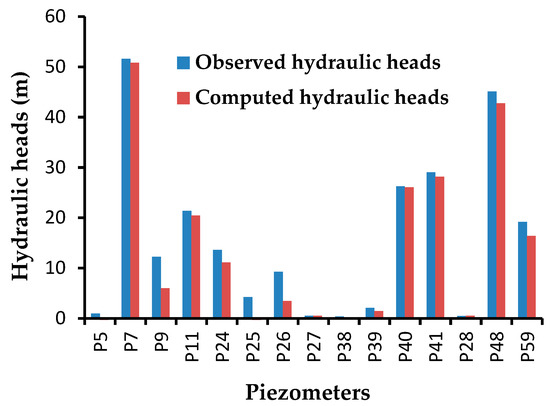 To validate the transient model, two years were chosen: 1978, the reference year, and 1992, year for comparison, with 14 time steps over a year. Notably, the actual piezometric levels that were observed in 1992 were compared with those simulated from 1978 to 1992 by the model. In this comparison, 15 piezometers that were active in 1978 and still functional in 1992 were used. After 5110 days, i.e., from 1978 to 1992, the number of pumping wells increased, and the flow rate increased from 177,504 m3/day in 1978 to 355,761 m3/day in 1992. The model remains valid despite the maximum deviation value of more than five meters that was observed at P26 (Zoo 1). In addition, in the calculated correlation coefficient between the observed and computed hydraulic heads, R2 is 0.96. Appendix A Table A2 gives the difference between the observed and computed hydraulic heads in 1978. Moreover, the water imbalance in the model (the difference between recharge and consumption) is 1.67 m3/day (Table 2).