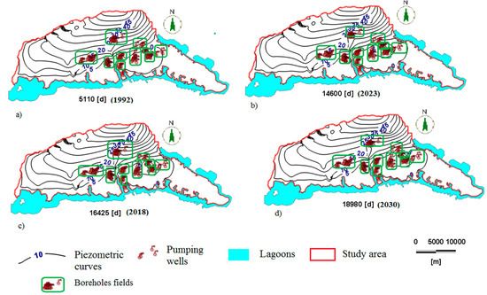 Simulated piezometric isolines (five-meter interval) (a) 1992, (b) 2018, (c) 2023, and (d) 2030.