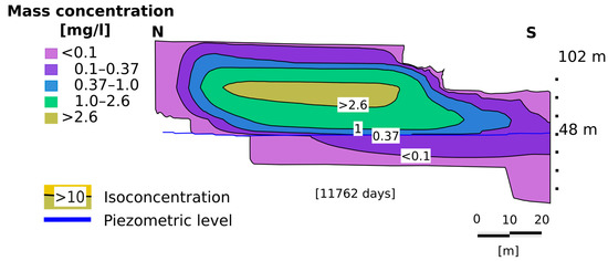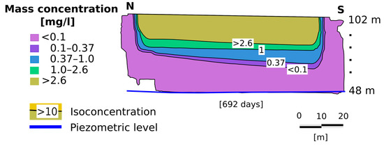 The Northern Abidjan District, which is mainly the Abobo municipality, is considered the main recharge area [52]. In addition, the volumes of the tanks of at the N’Dotré and Anador gas stations are known. The global pumping rate ranges from 177,000 m3/d to 470,000 m3/d at the beginning and end of the simulation, respectively. In this extreme case without any pollutant attenuation, only hydrodynamic dispersion and the infiltration of water contribute to decreasing the concentration of dissolved benzene from the ground surface to the water table. Figure 11 shows the north–south cross-section of the area to illustrate the vertical migration of benzene.
