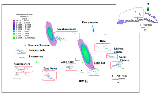 In this analysis, the maximum concentration of 0.37 mg/L from the unsaturated zone simulation was injected into the saturated zone at the N’Dotré and Anador sites. Figure 14, Figure 15 and Figure 16 show the dissolved benzene plume in two dimensions (2D) at five, 20, and 52 years without delay. All these pollution plumes evolve in a north–south direction. These plumes of pollutants extend considerably and reach some of the surrounding boreholes.