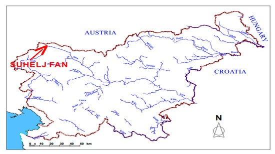 Location of the Suhelj fan in the north-west (NW) of Slovenia (Slovenia location: Long: 13.38°–16.61°; Lat: 45.42°–46.88°).