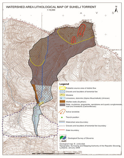 The Suhelj torrent is a part of the Upper Sava River (part of the Danube River basin), and it is located in north-west (NW) Slovenia (Figure 1) in the Western Karavanke mountain range [24]. Figure 2 shows a lithological map of the Suhelj torrent. The upper part of the catchment area is made of Lower Carbonifeorus rocks (slate, mudstone, greywacke, sandstone and quartz conglomerate, marl and limestone), and the lower part, including the torrential fan, is made of limestone and dolomite). In the uppermost part of the torrential catchment (close to the watershed and the border with Austria), there is large active sediment source yielding large quantities of fine-grained debris material to the Suhelj torrent (Figure 2). The sediment source was initiated in the years 1880–1890 as a large earth slump, and it has been estimated that up to now roughly 750,000 to 800,000 m3 of prevailing sandy–clayey sediments have been eroded from the source and transported downstream along the Suhelj torrent [25]. In the past, several check dams (the largest, 7 m high, is shown in Figure 3) were built in order to stabilize the channel bed and to capture debris flows and hyperconcentrated flows upstream of the populated Suhelj torrential fan. It should be noted that check dams are located upstream from the fan and thus do not impact on the simulation results.
