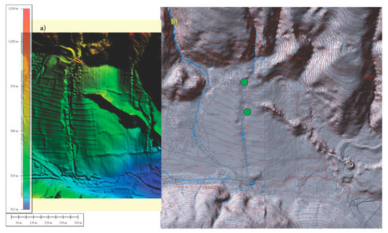 (a) Digital elevation model of the Suhelj torrential fan with indication of the input hydrograph location (orange polygon) used for the numerical simulation of fan formation by debris flows; (b) Locations of probing excavations on the Suhelj torrential fan (modified from [25])—green circles.