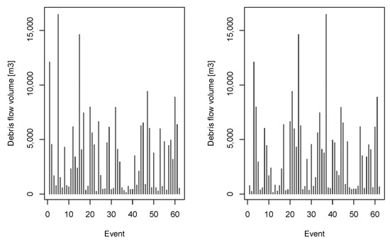 Due to lacking our own extensive database of historical debris flows on the Suhelj torrential fan, we tried to find good historical data in the Alpine environment with a rather long sequence of debris flows. Based on the study carried out by Stoffel [27], we defined the debris flow magnitudes that were used in this study. Stoffel investigated historical debris flow activity in a small catchment named Ritigraben (catchment area less than 5 km2) in Switzerland. Using tree-ring records and field surveys, Stoffel was able to estimate the magnitude of 62 debris flow events that occurred over about 150 years [27]. Stoffel classified debris flow magnitudes into four classes: S—small (25 events), M—medium (20 events), L—large (14 events), and XL—extra-large (3 events). Stoffel reported debris flow magnitudes as a range between a minimum and maximum value (e.g., for the S class, between 100 and 1000 m3). Because the literature about debris flow magnitudes is sparse and there are not many studies that have investigated the debris flow magnitude–frequency relationship (e.g., [28]), especially not in an environment similar to Slovenia (i.e., the Alps) we decided to adopt the magnitudes reported by Stoffel [27]. The only modification that was made compared to the previously mentioned study was that the maximum magnitude for the XL class was reduced from 5 × 104 m3 to 2 × 104 m3 based on the investigation performed by Sodnik and Mikoš [26]. For each class, the actual debris flow magnitudes were generated using a uniform distribution based on the minimum and maximum values of each class as defined by Stoffel [27]. The permutation was used to define the random sequence of debris flow events. Figure 6 shows an example of two different random sequences of the 62 investigated events. It should be noted that the total volume of debris flows (ca. 225,000 m3) was kept constant during simulations of different sequences.