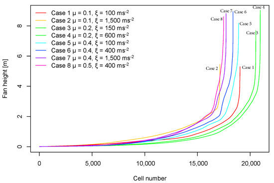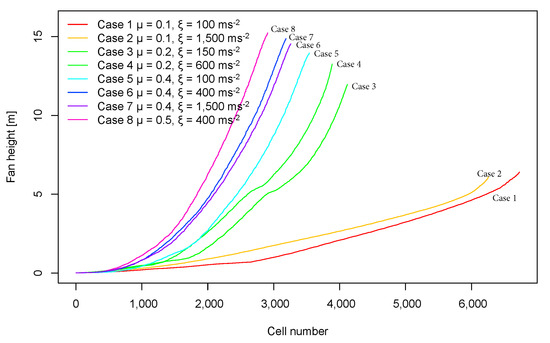 Figure 8 shows ordered elevation differences for one of the sequences for the different parameter sets shown in Table 1. One can notice that smaller µ parameters generally yield smaller fan heights and, consequently, smaller fan slope.