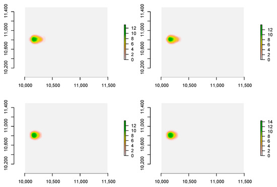 Debris flow fans after 62 simulations for the artificial terrain. The upper row shows results for µ = 0.2 and ξ = 600 (two random sequences; x and y axes are coordinates) and the lower row shows results for µ = 0.4 and ξ = 100 (two random sequences). Legends of figures represent the total deposit thickness, and the unit is meters.