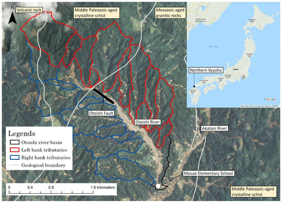 - Yada, J.; Yano, K.; Yamamoto, S.; Hosoya, T. The Northern Kyushu Heavy Rain Disaster in July 2017, Possibility of the Geological Predisposition of Fault Fracture Zone and a Large Amount of Sediment Discharge Accompanying Otoishi Fault (Tentative Name) [Heisei 29 nen 7 gatsu Kyushu Hokubu Gouu Saigai Otoishi Dansou (Kashou) ni tomonau Dansou Hasaitai to taryou no Dosha Ryuushutsu no Chishitsuteki Soin no Kanousei]. 2017. Available online: http://www.jseg.or.jp/kyushu/#disasterreport (accessed on 6 December 2017).