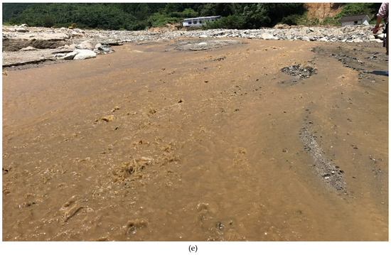 Figure 2d shows the flood sediment of this disaster. This sediment was confirmed throughout the Otoishi River basin and it is considered to have been transported from a source of collapsed soil and debris flow sediment accompanying slope failures. It was confirmed that the flood sediment is composed of sand and granules, including a slightly pebbly layer. Characteristically, the sediment is covered with pebbles. There is little clay because it is fragile when dry and crumbles easily.