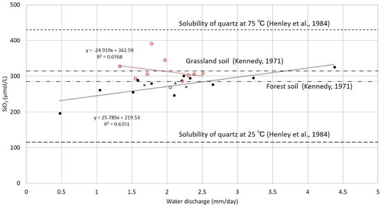 The relationship between the water discharge (mm/day) and the dissolved silica concentration (µmol/L). (In Figure 4, the black circle shows the data of the left bank tributaries, the red circle shows the data of the right bank tributaries and the plus sign shows the mainstream data. The values of solubility of quartz at 25 and 75 °C are shown in Figure 4 as reference [22]. The reference values of grassland soil and forest soil are also shown [10].).