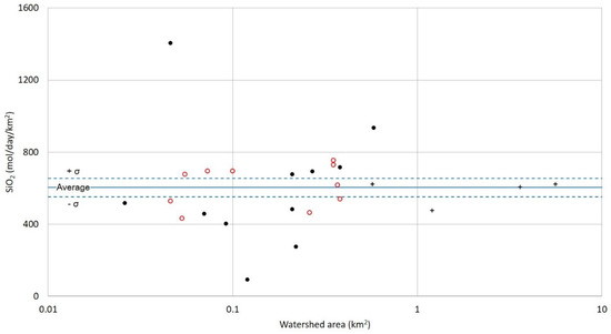 Figure 5 shows the relation between the watershed area (km2) in the sub-basins and the silica fluxes (mol/day/km2) based on the water discharge and concentration. The silica fluxes on the right bank tributaries exhibited a narrow range regardless of the catchment area, whereas the silica fluxes on the left bank tributaries exhibited a wide range. Particularly, it was confirmed that the variations in small catchment area were wider. In Figure 5, the average values of the silica fluxes and the values of the average ± the standard error (σ) are shown by the blue lines. The silica fluxes of the mainstream were distributed within this range.