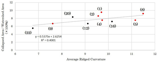 where U is the surface uplift rate. Since U is constant in a narrow region, rises with the erosion of the basin. From Table 1, the relationship between the collapsed slopes and the ridged curvature was examined (Figure 6). The correlation coefficient was ~0.63 for the analyzed tributaries in the case that the collapsed area against the watershed area is more than 5%. It is assumed that the correlation was confirmed only in some tributaries because the stage of geomorphic development is different. The result suggests there are many watersheds that tend to erode in the right bank tributaries.