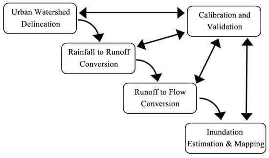 The GIS framework incorporates calibrating and validating the flood mapping model. The flood mapping is achieved through the steps of rainfall to runoff process, runoff to flow process, and inundation estimation process. Calibration and validation generally use observational flow and depth data to adjust parameters of a flood model, and once calibrated, to test the robustness of the model. The parameter calibration can be carried out in two ways, i.e., either by optimizing model performance or through expert knowledge [42]. In both cases, optimization of calibrating parameters is conducted by following a trial and error procedure, where the errors are estimated by various statistical measures, e.g., root mean squared error, mean absolute error, and absolute percent error. The most frequently used approach is the optimization of model performance, which is more appropriate for gauged watersheds. This direct method uses historical flow and depth records for calibration and validation. With an increasing availability of information, various new calibration and validation techniques have been developed such as [43] has used GLUE method combined with Monte Carlo approach. It may not always be feasible to calibrate and validate a model in ungaged watersheds due to lack of historic data. Since many urban micro-watersheds are ungaged lacking sufficient information for calibration and validation, a simple and parsimonious approach can be applied using the local and physical information such as the one reported by [44]. Since flooding in urban areas often occurs rapidly and lasts for short time durations, it is difficult to obtain good historical observations [13]. The calibration in ungauged basins can be achieved through expert knowledge with reasonably good solution [42]. In this case, the visual information of flooding (e.g., satellite images, aerial images, and images captured by a camera) can be used to crosscheck model results. In this indirect method, soft calibration and validation is achieved with data gathered from photographs, newspaper reports, online articles and field visits. These information, if possible, can be divided into two groups where one group of information can be used for calibration and the other one can be used for validation [13].