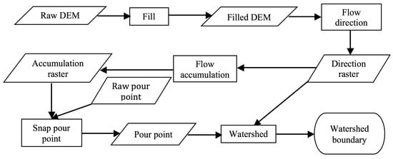 DEM data can have some inherent issues that need to be considered. Typically, it is reconditioned by removing elevation abnormalities, filling data gaps, and raising depressed pixels. Low-pass filtering is usually done to smooth the data, which in turn helps to remove abnormal peaks and flat areas, i.e., irregularities in elevation data [21]. The filling process results in depression removal by raising localized sink elevations to match the adjacent cell in order to ensure a continuous stream network. The reconditioned elevation data is further processed to estimate flow direction and accumulation in each cell. The cells exceeding a certain threshold of accumulation (typically 1% of maximum accumulation) are identified to form streams [22]. Often, threshold values can be based on the length of sheet flow (overland flow) in a watershed [22]. The flow accumulation greater than the threshold is considered to be stream network that is used to delineate watershed for a specific pour point. It is imperative that a given pour point is snapped to the stream network to ensure proper watershed delineation [23].