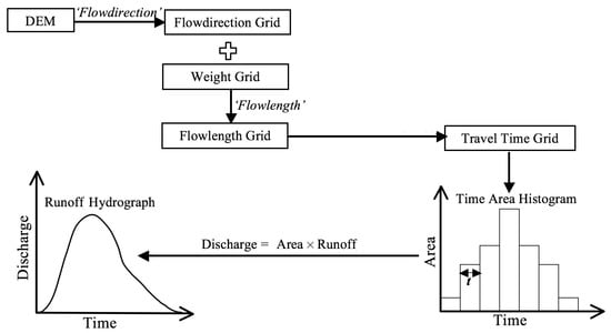 The time-area method method estimates the travel-time of each cell, and groups them into regions of equal travel-time called isochrones. Figure 3 shows the time-area approach for creating runoff hydrograph at the watershed outlet (modified from [33]).