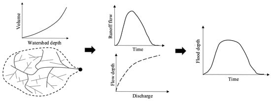 There exist numerous studies on urban flood modeling to estimate inundation characteristics (flood depth, extent, and duration) from a runoff hydrograph [1,5,36,37,38,39]. The most common theme in estimating inundation or ponding is through the application of mass balance. Ponding occurs relatively in low laying areas with no drainage or at the drain inlets with limited discharge capacity. For a given time step, if watershed discharge is greater than the drain inlet discharge capacity, then inundation or ponding occurs. In this process, the low lying areas are first inundated followed by the higher elevations in the proximity. In case of a pour point formed due to no-outlet depression, all runoff contributes to inundation or ponding.