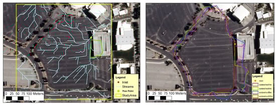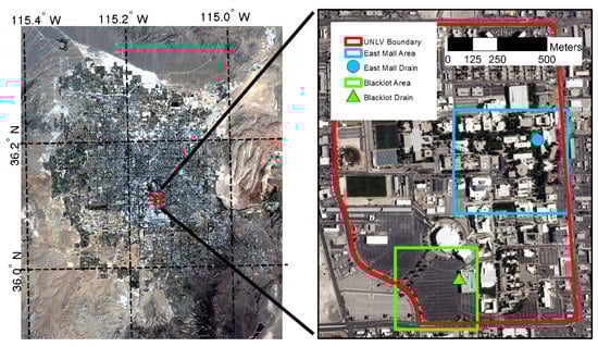 The East Mall is located on the east side of the UNLV campus. The area serves as a site for many student functions as well as campus tours, receptions, and conferences. This area is dominated with vegetation as shown in Figure 5, and also has asphalt (parking areas), concrete (buildings) and gravel. The drain inlet of this study site is a curb opening sump inlet type. It is 42 inches (106.7 cm) long with a curb-opening height of 6.5 inches (16.5 cm), and is identical to the R type curb-opening inlet [52]. A GIS-based framework similar to Blacklot is applied, and some specifics are described below.