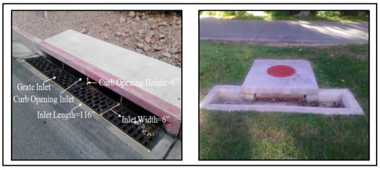 The Blacklot storm drain inlet is a street sump type installed along the side of the access road as shown in Figure 6 (left). Figure 6 (right) shows East Mall drain. The Blacklot drain inlet has equal length combination of grate and curb-opening with 116 inches (294.68 cm) length, 18 inches (45.72 cm) width, and 6 inches (15.24 cm) of curb-opening height. This inlet is also a combination type 16 as each segment consists of a vane grate and a curb opening [40]. The following paragraphs describe the specifics of the GIS-based framework for this area.