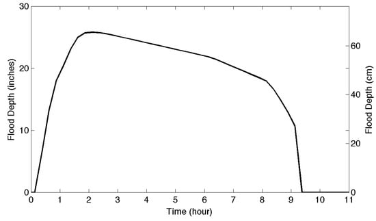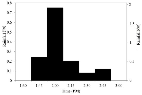 Rainfall to runoff conversion is done using SCS-CN method as described in USDA TR-55 manual [27]. In this method, runoff depends on the surface curve number based on soil hydrological group and the land cover class. The hydrological soil group (HSG) data for the study sites were collected from Soil Survey Geographic Database (SSURGO) [47], and the land cover data was collected from National Land Cover Dataset published in 2011 [48]. It is found that the study area has a hydrologic soil group type A, and considered to have developed-medium intensity and developed-high intensity land cover characteristics. The curve number is determined using the conversion table in USDA-TR 55 manual with typical average antecedent moisture condition (AMC II). Blacklot area consists of 86 and 95 curve number surfaces, and thus most of the rainfall becomes runoff. Rainfall data were collected for the flooding day from Clark County Regional Flood Control District (CCRFCD) (http://www.ccrfcd.org/raingauges.htm). The rainfall hyetograph from the nearest station (Station ID: 4574) is used, and shown in Figure 8. This station is also closest to the East Mall study site. It should be mentioned that the total rainfall recorded at this station was 1.38 inches (3.5 cm) which is approximately 35% of the average annual rainfall of the Las Vegas Valley (approximately 4 inches/10.16 cm).
