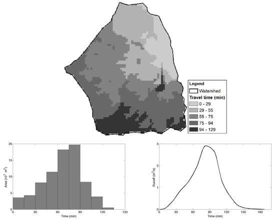 Figure showing travel time map (on the top), time area histogram (on the bottom left), and runoff hydrograph (on the bottom right) of the Blacklot watershed.