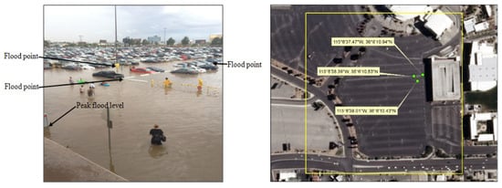Imagery used for model calibration showing the location of some of the known flood points and the peak flood depth location at the inlet where watermark was still intact after flooding (on the left) verified through a field visit, and the exact geographic location of the points recorded via field visit with a GPS (on the right). Courtesy of Rebel Yell, University of Nevada Las Vegas.