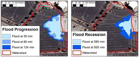 Inundation estimates were computed from the runoff hydrograph and the stage-discharge curve of the drain inlet. The effective discharge capacity of the drain inlet at the maximum allowable water depth of 6 inches (15.24 cm) is 11.82 ft/s (0.33 m/s). The results reveal (see Figure 11) that flooding started after ≈20 min and lasted for several hours. The areal extent is also determined from flood depth by creating contours on the DEM (See Figure 12). Inundated areas at 30, 60, 124, and 500 min are 11,172, 14,672, 17,834 (peak flood), and 13,855 m, respectively. While the model is calibrated using the flood depth information, the validation is performed using the geographic locations of the flood points shown in Figure 10 (right) and the flood starting time information. It is found that the points are within the computed inundation extents, and the flood starting time match closely with the reported flood beginning time (≈5 min) confirming the usefulness of the model for this site.