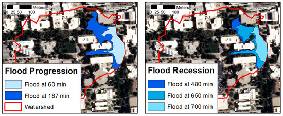 Often it is difficult to acquire the data for model calibration and validation, and thus to assess the accuracy of spatiotemporal behavior of flooding. The post-flooding watermarks often remain intact for several days and can be used to determine the full flood extent. The inherent consistencies of the spatial nature of flooding could ensure such soft calibration and validation to produce results as observed in Blacklot and East Mall.